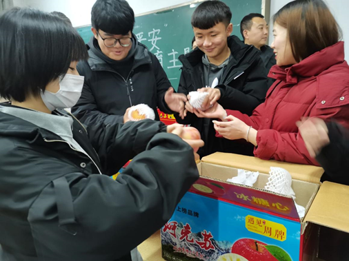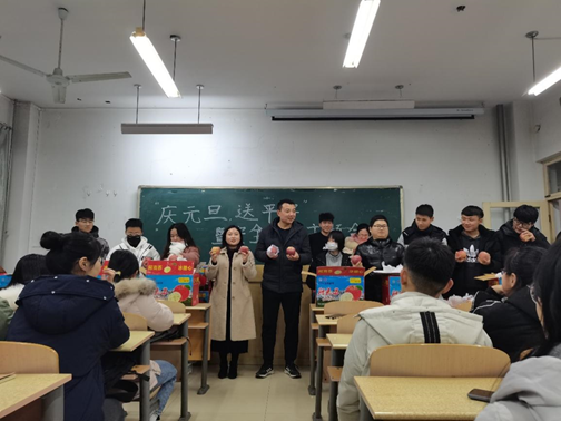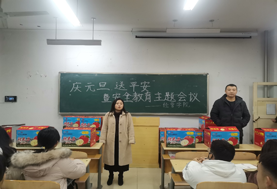 首先,学生科长张智涛强调了安全问题的重要性,要求全体学生切实增强安全意识,做好安全防范措施,谨防各类安全事故发生。随后,全体辅导员老师就假期离校前后安全管理工作向学生提出要求与建议。一是要注意疫情防控安全,主动向学校报备去向和做好个人防护工作;二是要注意离校安全,离校前务必做好宿舍准备工作,安全到家后要落实信息报平安;三是要注意交通安全,自觉遵守交通规则、法规,不做低头族,不搭乘无牌无证违规车辆;四是要注意饮食卫生安全,严防“病从口入”;五是要注意用电、用火与消防安全;六是要注意网络安全,注意防范诈骗,不轻信陌生人,不贪图小利,提高警惕,文明上网,不传播、不下载、不参与讨论带有反动、影响社会安定团结或淫秽内容的信息;七是要注意劳逸结合,不忘学习,在家主动参与家庭劳动,多回想、复习所学专业知识;八是注意控制自己的情绪,做情绪的主人,在外与人相处要言行文明,要多换位思考,不惹是生非,不参与迷信活动。接着,全体辅导员老师为各班同学发放爱心苹果、送上元旦祝福,并希望同学们能够度过一个安全快乐的寒假。最后,深受感动的同学们与辅导员老师们合影留念。