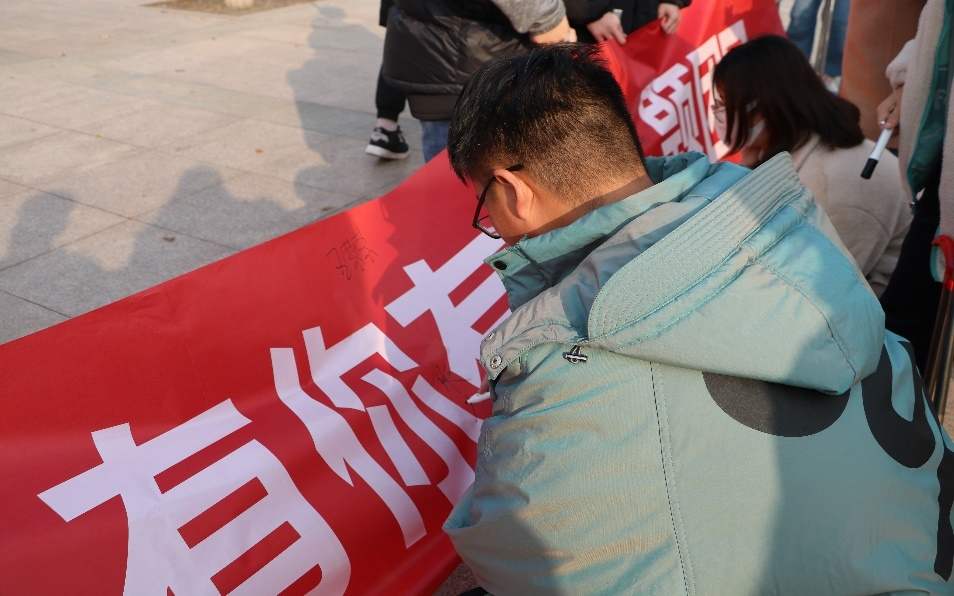 此外,来往的学生对志愿者们护卫校园环境的行为不免赞叹,自发在横幅上签署自己的姓名,为“创文明校园,筑和谐校风”发出自己的一份青年之声,并表明自己以后也会以护卫校园文明当做自己的一份责任,立足现在,面向未来。