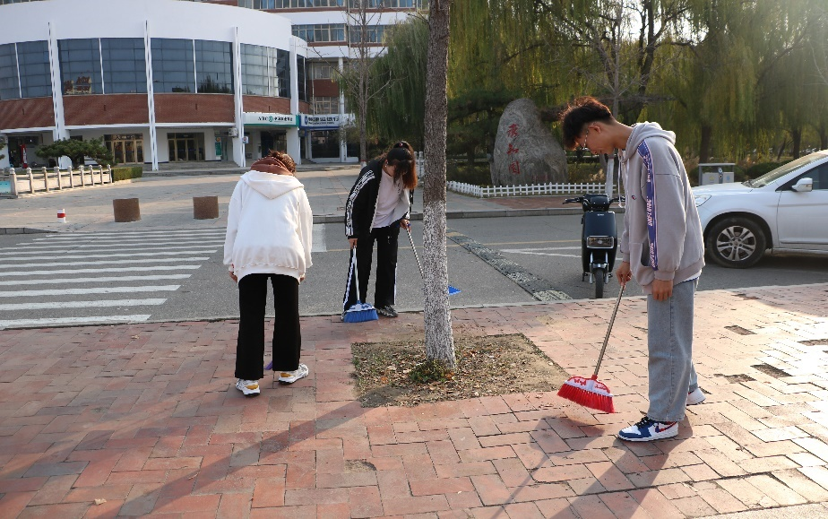 活动伊始,志愿者们自备好清洁工具,提前10分钟到达二餐广场听从活动负责人的清扫分工安排并悬挂好活动横幅。随后,志愿者们以小组形式对二餐广场及周围道路进行了细致清扫,分工合作、搭配得当,道路焕然一新的整洁让原本11月稍稍寒冷的天气也有了一丝暖意。