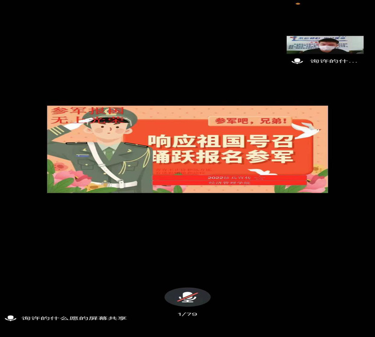 为全面贯彻习近平强军思想,普及大学生应兵入伍政策知识,4月10日上午,我们于6#310会议室组织开展线上征兵入伍宣讲会暨退役复学学生军旅生涯分享会。学院党总支副书记于峰、学生科科长张智涛、学院征兵工作联系人刘彬老师参加会议。此次会议邀请到三名学院优秀退伍复学学生作为主讲人为我们18级本科和19级专科全体学生分享军旅生涯经验,普及当前大学生应兵入伍相关政策。