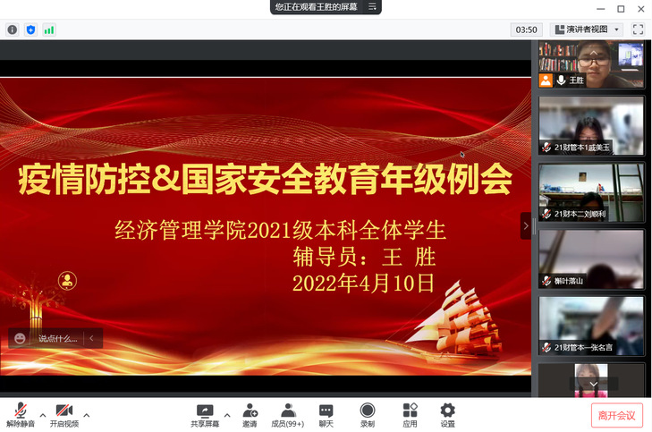 为进一步落实学校疫情防控要求,加强学生思想建设,4月10日晚七点437ccm·必赢国际召开21级线上年级例会,辅导员王胜老师主持会议,各班班主任及全体21级本科学生参加会议。