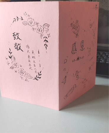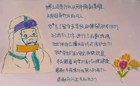 在“温情卡片的传递”中同学们向住校辅导员、隔离区值班老师、楼管阿姨、学生志愿者等在疫情防控中为大家做出贡献的人们表达了真挚的感谢和美好的祝愿,在“疫”无情中展现内心温暖的一角。