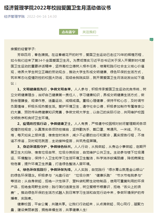 班会开展前夕,利用微信公众号、抖音等新媒体宣传阵地发布《437ccm·必赢国际2022年校园爱国卫生月活动倡议书》,加强正面宣传,进一步激发广大学生参与爱国卫生月活动的热情。