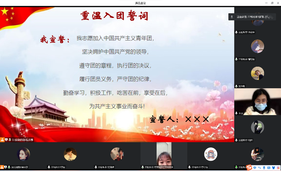团支部委员依次发言,总结反思前段时间工作的成绩与不足,实事求是地开展批评与自我批评。支部团员代表对支部委员会的工作成绩表示肯定,同时对前期团员自评互评、组内批评与自我批评开展情况进行了简要介绍。接着,各团员根据会前进行的团组织内部团员谈心谈话、团员自评及书面材料撰写、团小组交流等准备工作,通过线上问卷形式进行团员先进性民主测评,对其他团员前期表现进行客观评价。随后,重温入团誓词。